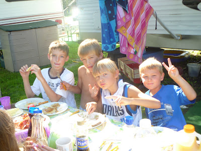 Spending time with Al and Sherra, and providing the opportunity for our kids to make new friends was truly a great experience. Al and Sherra (and Sherra's parents Vern and Elaine Ten Appel) treated us like kings as we slept in a beautiful camper (with air-conditioning!) Have we mentioned how hot it has been all along our trip? We are not used to 40 degree Celcius with high humidity!!! So the camper gave us a wonderful restful place to get our energy back for skiing, tubing, fishing, swimming and hanging out together. The first night the kids were having so much fun we didn't even notice is was midnight and they were still out frog hunting. This brought our mosquito bite count for one night to a grand total of about 50 for Toby. The bugs have been biting all vacation and we all are learning to cover-up and spray, but frog hunting has raised it to a whole new level. Toby and Jude were neck to neck with almost 50 each! But by morning they are almost recovered. Good talks and delicious campfire treats seemed to end each day and we are so grateful for our time with our friends. The kids trully loved being together and the freedom they had to roam the campground and explore was an extra treat.